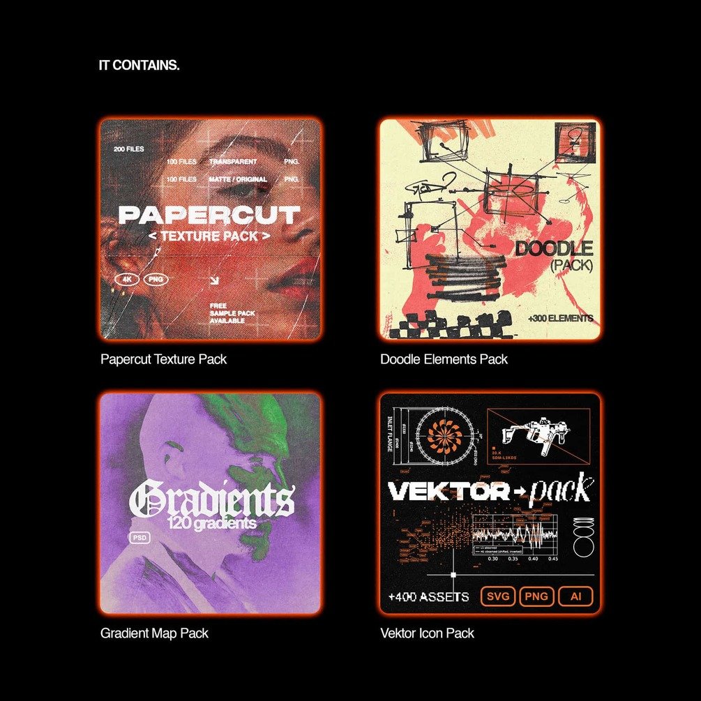 - Papercut Texture Pack: Add depth and raw texture to your designs with a variety of high-quality, rugged papercut textures.